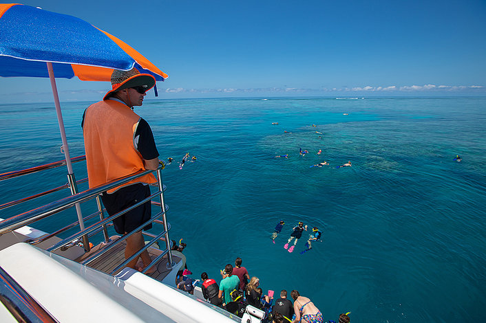 Evolution departs Cairns at 8.15am sharp. Relax onboard our spacious air-conditioned modern lounges with a tea or coffee while you get to know our friendly crew who will go through safety briefings and get you all geared up for the day.