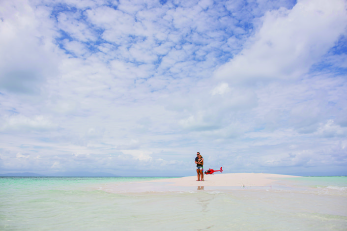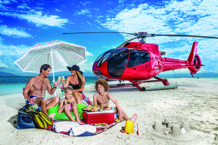 Scenic helicopter flight both ways to sand cay, picnic, sparkling wine, snorkelling equipment, umbrella and chairs.