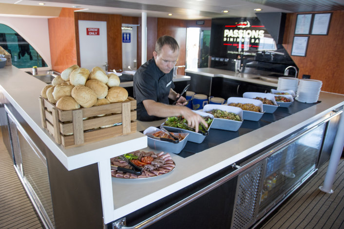 Your reef adventure begins with an informative briefing by an eco-guide before exploring two pristine Great Barrier Reef locations at moorings owned exclusively by us. A choice of 27 outer Great Barrier Reef sites means Passions can select the location best suited to the weather. The trip includes snorkeling equipment & tuition, a hot and cold buffet lunch freshly prepared by the onboard chef plus friendly trained staff to teach snorkeling techniques and educate you about the Great Barrier Reef.