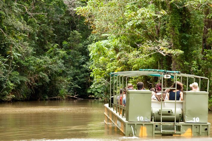 Board here for your unforgettable 45 minute rainforest tour on an amphibious World War II Army Duck (officially spelt DUKW). Rainforestation has 12 of these historical vehicles, which hold up to 30 passengers and have 6 wheel drive, propeller and rudder.