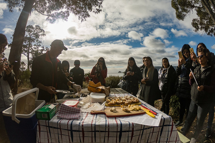 We visit Adventure Bay before heading to South Bruny National Park where you will be astounded by the spectacular and rugged coastal views, expanses of coastal vegetation and the wildlife including whales, sea eagles, echidnas and more that call this area their home. It is here we take a short break for morning tea on the beach with a selection of Bruny Island Cheeses, Oysters and Wood-fired oven bread.